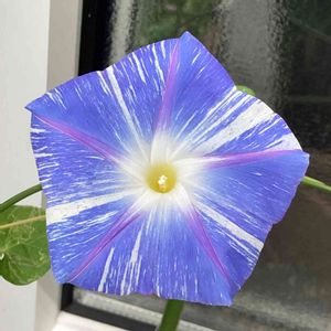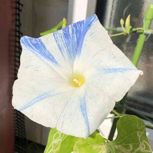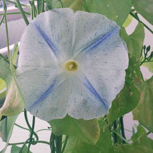 西洋朝顔 フライングソーサー 昨日は真っ白 今日はブルーのストライプ いろんなパターンのお花が咲きます。 白い朝顔に縦縞の模様が入る朝顔です♡ フライングソーサーは空飛ぶ円盤、UFO という意味です🛸 どうしてこのネーミングなのか、また謎が増えました(笑)
