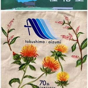 今日のお花 ①ベニバナ 藍住町と山形県河北町は友好都市 紅花と藍で交流。 町制70周年記念のバッグに、紅花と藍の花をペイントしてみました。 ②ベニバナ生育中 ③ジキタリス ④キショウブ ⑤ニゲラ