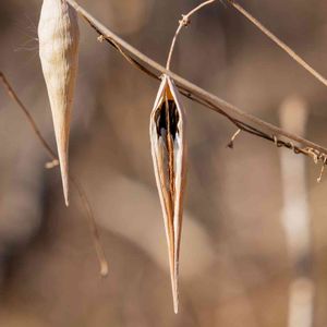 🌿コバノカモメヅル🌿小葉鴎蔓 9/4に投稿したコバノカモメヅルの熟した果実(袋果)と種子です。 絹糸のような種髪がきれい🌟 花を撮ってからずっと観察してきました👀 花後すぐに子房が膨らみ始めたのですが、 ずっと緑色のまま😕 色が薄い褐色に変わってもなかなか開かず、『いつになったら開くの?』って感じでした。 2022.12.4撮影