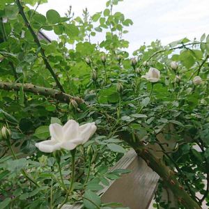 どんよりなお空。☂️が降ったり止んだりしてます。 我が家のバラ第一号はレッドキャスケードでした☺️手の届かないところではしっかり開いてます🎵 今年も白く咲いてます。日当たりが良いとこに移動したのにな。なんでかな 一昨日初めてうちにバラクキバチが来てしまいました😢何種類かの茎が8本くらい項垂れてカットしました。本当にショック…それらしき蜂が居たの見てたのになー もう来ませんように…