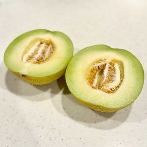 初めてのメロン栽培、雨、風で袋の中で落ちていて、日数短いですが…収穫して5日ほど追熟してカットしました✨️🍈 小さかったですが…ちゃんとメロンの味、香りがしました…美味しく頂きました✨️🍈💚🍈💚🍈💚(*˘︶˘*).。*🍈