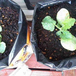 食べたメロンの種からの袋栽培2年目のF3苗です。 右側が接ぎ苗の子、左は普通に育てている苗です。 同じ日に本葉4枚で成長点を欠きました。 接ぎ苗の方が脇芽が出て来るのも早いです。 カボチャの根が成長を助けてくれているのかな?