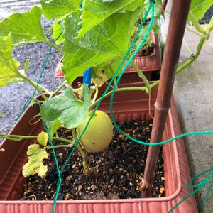 【🍈メロン(ネット系・青肉)品種不明】食べ終えた種から育てる!🌱3/27日、1回目の種まきは萎れて失敗💧4/19日、2回目の種まきから順調に育って。6/9日プランターに定植し、6/16日に1番花が咲きました。小玉スイカみたいに、空中栽培の予定です!難しいと言われているメロン…実がなるといいなぁ〜💕