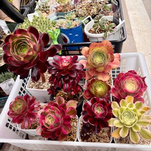 こんばんは✨✨ 去年の11月、12月にお迎えしたアエオニウムさんたちの半分です(*'▽'*) 冬場は室内に入れてたからどの子も同じような緑色だったけど 最近は外で日に当ててるから良い色になってきてます🥰