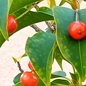 今年も、青々とした葉のなかで、ソヨゴの赤い実を見つけました①② モチノキ科 モチノキ属 常緑小高木 別名はフクラシバ 波状の葉がそよそよと風に揺れることから命名された ようです 6月頃に目立たない白い小さな花をつける 今年も花を見過ごしてしまいました 「冬青」は、冬でも葉が青々と茂っている常緑樹のことだそうです 他に赤い実を付ける木がそばに生えていました ③ナンテン 真っ赤な実がたわわに成っていました もうすぐヒヨドリの餌食になってしまうのかな? ④クチナシの実 クチナシの実は味や香りがほとんどないため、食材や料理の風味を損ねることなく色付けすることができます もうすぐお正月ですね 栗きんとん作りに欠かせないですね 🏷️木曜日は木 🏷️木曜日の木々たち 🏷️木曜日は気(木)になる実