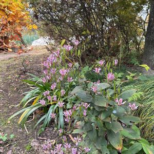 タイワンホトトギス(台湾杜鵑草) *ユリ科ホトトギス属 花期は9〜10月 自生は台湾.西表島の滝の水が滴る湿った場所に自生する多年草! 園芸用として植栽はあり、植物園などでよく見かけます! 秋色の枯葉が多い中、鮮やかに良く目立ちました! 11月6日撮影