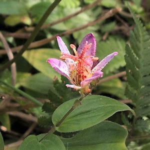 筑波実験植物園のタイワンホトトギス。 タイワンホトトギスも色々ですね。筑波実験植物園の花は、茎も葉も花も繊細な感じ。ほんのり青紫色の花びらです。