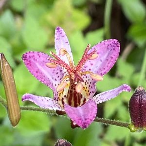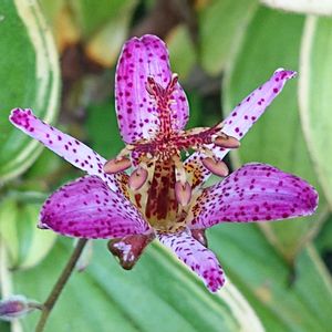 面白い形のお花です😊 タイワンホトトギス。 ユリ科ホトトギス属のお花。 おしべめしべが目立ち、立体的なお花に見えます。特徴的なかわいいお花ですね🤗
