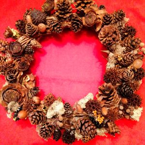 今日のお花 マツ ずーと前からあります壁の一部です🤣🤣🤣 アケビの台に色々な種類のマツボックリをくっつけただけのリース