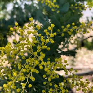ミモザ。 マメ科アカシア属常緑高木。 ポンポンみたいな可愛らしい花が咲いてきました😃 歩道脇公園