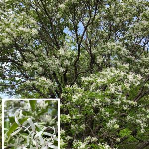 ヒトツバタゴ(一つ葉田子)。 モクセイ科の落葉広葉樹。 別名 ナンジャモンジャ ウミテラシ(海照らし) 名前が分からなかったのでナンジャモンジャ😆 そして、散った花弁が水面を明るく照らすことからウミテラシ。風流ですね😊 中央公園
