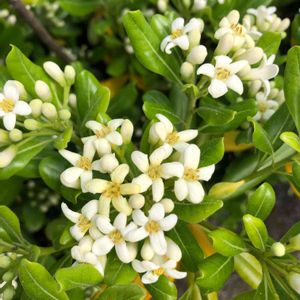 トベラ(扉)。 常緑低木。 うっすらと黄色がかった白い花がたくさん咲いていました😊(白色のち黄変するようです。) 遊歩道