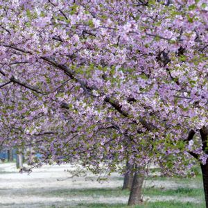 大島桜 葉っぱも明るいグリーンが綺麗。 ハナダイコンの紫色もまた綺麗。 こちらは根の保護のためだそうで、 かなりの大樹なのです。