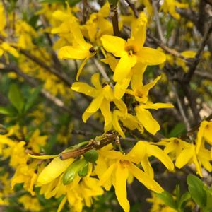 レンギョウ (連翹)。 黄色いお花と初々しいグリーンの若葉がとてもお似合い😊 歩道の植え込み