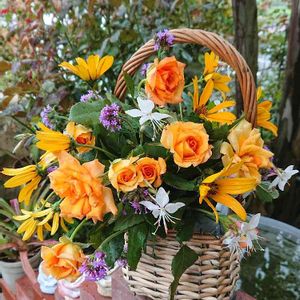 今日の花束💐 いよいよ切れるのが少なくなってきた~😂 チンチン🌹のオレンジをメインで、サハラ'98🌹とブリッジオブサイツと黄色いジニアと小菊で色合い合わせた……つもり😅 ユーカリも数本🎵 香るかな💓