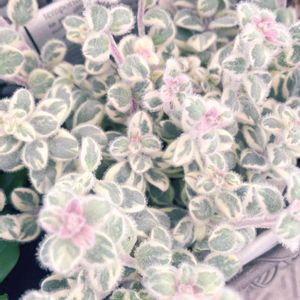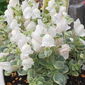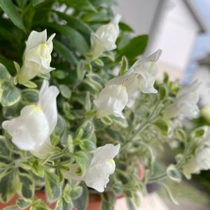 宿根金魚草、アールグレイの斑入り品種‼️ モフモフの斑入りの葉に白い花、可愛い😍💘儚げだけど大丈夫かな…出会えたことに感謝です🥰