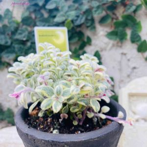 おはようございます♪̊̈♪̆̈ 朝モヤが凄いです✨そして寒い〜 こちらは可愛いリーフちゃん🪴 宿根金魚草 ムーンライトオブトリニティ アールグレイの斑入り品種だそうです·͜· 葉っぱは柔らかくて羊毛フェルトみたいにもふもふ🐑♡ 寒さに弱そうだなーと思ったらそうでもなく、暑さにも強いみたいで頼もしいわ( •̀ᴗ•́ )و 寒さのせいか、ピンク色になってる所もあって ますますお気に入りになってしまいました(∩´∀`∩)❁⃘*.゚ タグも素敵なので付けっぱなし🌙
