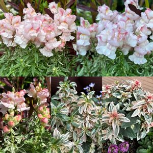 昨年、12月に植え付けた斑入り金魚草シュガーラズベリー❣️ 春にパンジービオラよりもノースポールがどんどん大きくなりすっかり隠れてしまって、大きくなれませんでした。 ベンチの模様替えをした時に金魚草だけはそのままにして様子を見てました。 半年掛かってやっとお花を見る事が出来ましたーッ‼️😆 ピンクが入ると雰囲気が変わりました💕 が、しかし… あれっ?? 何故かピーチも居る💦 ラズベリーを2鉢購入したつもりだったのに😂😂 でも、一株でも存在感があるので良かった気がします🥰