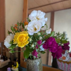 玄関に活けた香椎花園のつるバラの花が減ってきたので 咲いていたサマースノーとスプレーバラを加えた 高さがイマイチだけどもう良いや…