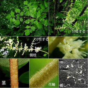 チダケサシの仲間の判別は難しいですね。一般的にトリアシショウマは3回3出複葉で花序の側枝はよく分枝するようです。チダケサシやアカショウマはほとんど分枝しないそうです。 写真の植物はまだ蕾が多いですが、花序の側枝がよく分枝しているのでトリアシショウマと思われます。ただ、通常の3回3出複葉であれば、3の3乗で全体の小葉の枚数は27。点線で囲んだひとつのブロックは9枚となるはずですが、写真のものは11枚あり、全体として2回奇数羽状複葉に近い見た目となっています。 先日に投稿したチダケサシは通常であれば2~4回奇数羽状複葉となりますが、逆に3回3出複葉のようになっていましたし、葉の付き方のみで見分けるのは難しそうです。 先日のチダケサシはカキツバタなどの生える湿地にて撮影したものです。観察で気がついたことは、側枝は斜上して分枝せず、葯はピンク色を帯びて、花軸には明瞭な腺毛があるということです。 今回のトリアシショウマと思われるものは山地にて撮影したもので、側枝は分枝して、葯はクリーム色を帯びて、花軸には開出毛がありました。多少べたついたので腺毛もまざっていると思いますが、先日のチダケサシの花軸には水玉のような腺を先につけた毛がたくさん生えていましたので、それと比較すると明瞭とは言えない気がします。ただ、個体差もあると思うので一概には言えません。 また、トリアシショウマの新芽は山菜としても利用され、実際に食べたこともありますが、春先の新芽は赤褐色の毛でおおわれています。茎の上部はほぼ無毛でしたが、茎の下部には茶色の長毛が残っていました。 よく似ているバラ科のヤマブキショウマの新芽は無毛でしたので、もしかしたら判別点として使えるかもしれません。次に見かけたときは確認したいと思います。一応、ヤマブキショウマの雄しべの数は20個、チダケサシの仲間は10個となりますが、とても小さいので毎度たしかめるのは億劫ですね…😣 メモ ユキノシタ科 チダケサシ属