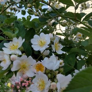今日のお花 ノイバラ タマローズ 昨年苗をお迎えして、畑にてフェンス仕立てにしました✨ 一年で伸びる伸びる‼️ 秋の赤い実も楽しみです❣️☺️🐰