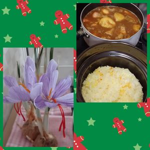 こんばんは😃🌃 今日の晩御飯🌃🍴 先日、咲いたサフランで、土鍋サフランライス🍚スープカレー🎶を作りました。(’-’*)♪🎵