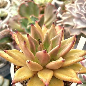 久々のエケベリア投稿"(⌯︎¤̴̶̷̀ω¤̴̶̷́)ノ📸 今のところはジュレ多肉も数少なくすんでます。サーキュレーターのおかげかな😊 暑くてタニパトもおろそかになってますが、暑すぎて🦟も出てこないから、明日はしっかりタニパトします ୧(⑉•̀ㅁ•́⑉)૭ トリマネンシス×ロメオ こんな色ですが、ダイジョブなカラーです✨🟡✨ 2枚目のが11月下旬の写真。