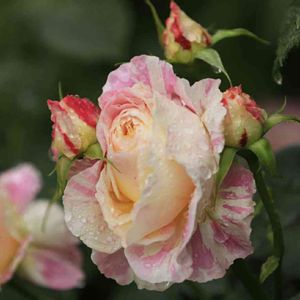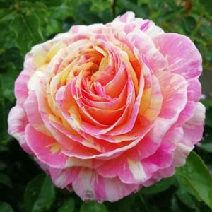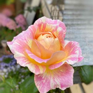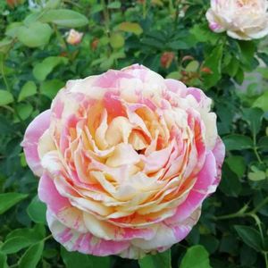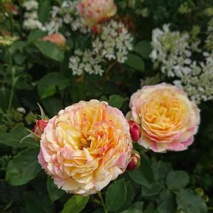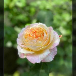 ⑽クロードモネ様 昨年の秋にお迎えしましたが、 我慢して咲かせませんでした。 この雨の中〜開花です。 花弁の色と雨の雫がぴったりマッチして、 まるで宝石の雫のよう💎 ピンクに淡いオレンジイエローの絞りが入る ロゼット咲き中大輪。 独特の華やかさとかわいらしさを併せ持った 魅力的な品種です。 ローズをベースにスパイシーと フルーティーの混ざる強香花。 たまりません💓 系統:S シュラブ 花色:淡い黄色とピンクの絞り 花形:ロゼット咲き 花径:中輪 芳香:中香 香質:ティーにパウダーとダマスク 開花 :四季咲き 樹高:1.1m 樹形:木立樹形 普通タイプ