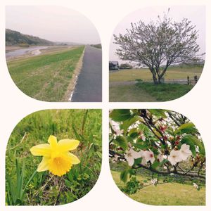 春先の河川敷でののんびり散歩 ポッリとスイセン! 黄砂がひどくてすぐ退散しました。(>_<)