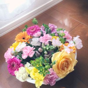 ❁ 春を告げる花々 ❁ 今日は風が強く、寒い日。 お花で春を感じます(๑˘ ˘๑)*.。 ガーベラ、スィートピー ダイヤモンドリリー アリウムコワニー