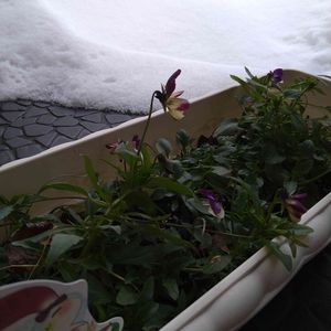 2023/01/05 お外は少し❄ 廊下のカーテン開けてみたら・・・ パンジービオラ達は目の前に❄舞う光景見ています 頑張ろうね👼