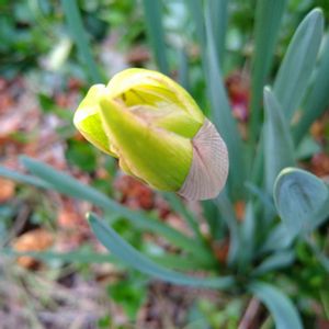 2023/04/03 🏷蕾組の子 付けさせて下さいね🙏 確か八重咲き水仙 南側、ブロック塀 狭い通路 日照時間少ない組の中でも遅い順番です。 明日は開くのかなぁ🤔