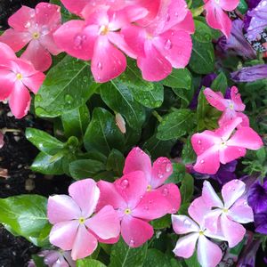 ニチニチソウ ⬆️ ミルキーポッポ ⬇️ ナツザクラ 夏桜 暫く雨が続きますね☔️大雨、お気を付けください(⁎ᴗ͈ˬᴗ͈⁎) 雨の中、お盆迎えです。