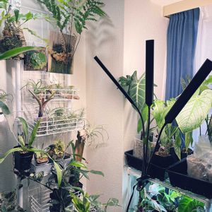 棚上が暗い問題を解決すべく育成ライトを新調しました🙋🏼‍♀️ ミニ温室用で使って良かったBrimのライトで今回は3本ライトのを購入✨ めっちゃ明るい😊 チララックにも沢山光当たる様になったので凄く良い👍 問題は棚上… 至近距離だけど大丈夫かぁ? 重いので設置場所も安定せず、ビカクシダ上のライトと交換しようかと思ったのですが、重くて無理でした💦 そして、今日も植え替えday✨ まずはコルクとネコチップとスリット鉢を買いに春日の平田ナーセリーへ😊 アンスのポリスキスツムとクワズイモのミント斑?に気を取られてしまいそうでしたが、我慢… 結局ブラックウォーターや肥料も買ったのでかなりの値段に… 植物買ってたらヤバかった😰 まずはトムから✨ 根鉢凄すぎて根っこどれ切って良いか分からず、バッサリいきましたがどうだろ… 村長がロムズレッドよりも植え替えで悪くなりにくいと言われてたので、多分大丈夫と思う🤔 新葉の先がちぎれてるのがホント残念なくらい立派な葉っぱなんです😂 次はペダトラ君🐅 この子もかなりの根鉢と、鉢底に藻がベッタリでちょっと弱ってたので、根っこバッサリいって、ベージュのスリット鉢にしました🤔 根っこ沢山切ったのに、鉢上げもしてしまったので、根腐れしないかちょっと不安です😖 切らなかった上の方の根は動いてるので、恐らくすぐ根は張ってくれると願いたい💦 オームルムも動き止まってるので、上の気根まで深植えにすることに🧐 この子も成長止まってて、根っこもそこまで張ってなかったので、根っこは切らずに土を出すだけにしました🤔 簡易ビニールハウスのライトに当たって、葉っぱがやけどしてしまってるので、もう棚上に置くしかないです😖 最後に、レッドスポットトリカラー😊 この子は成長止まって、根っこも動かず、じわじわ根腐れが進行してました💦 今回は葉っぱ沢山切って、鉢下げをすることに😖 空気が根っこに行き渡ってないのと、置き場所が悪くて光不足だったのかなと… 新芽がひょっこり出かけて数ヶ月経ってるので、目を覚まして欲しい😖 結局、コルクを買ったのに、板付けするの忘れてました😂