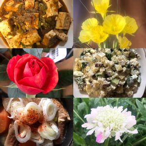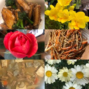 冬彩(ふゆいろ) お待たせしました、ひろしの創作 晩ごはんシリーズです🍲🥦👍🥒 初めて作った、酢味噌和え、右中は 具たくさんのチヂミ(オリジナル・ タレ)が、美味すぎる!笑笑😉 下は、蓮根きんぴらです! どうぞ、召し上がって、下さいね 花は、梅⚪️とガーベラ🔴にラナン キュラス🟡です!