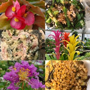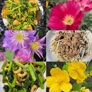 夏彩(なついろ) ひろしの日替わり晩ごはん🥬🥘 上から、ズッキーニとナス🍆炒め ・回鍋肉・ニラもやし・えのき炒め 花は、百日紅・ナツズイセン・ 烏百合です!