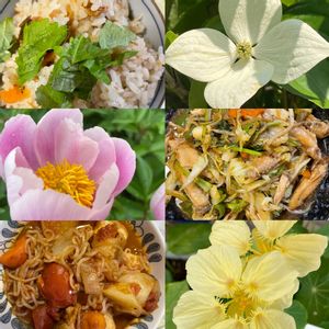 春彩(はるいろ) ひろしの晩ごはんに花添えて! 鶏そぼろ混ぜごはん・毛羽中 野菜炒め・根菜鶏肉トマト煮です! 花は、ヤマボウシ・芍薬・ナスタチ ウムです!