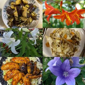 夏彩(なついろ) さぁ!ひろし主夫の晩ごはん シリーズ🍆🍻🥢 夏野菜茄子🍆野菜炒め、手羽先の 甘辛揚げ・・・! 花は、ヒオウギさん、キキョウに カサブランカです!