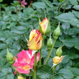 「つるチャールストン」 系統→ClF. クライミングフロリバンダ ※「チャールストン」の枝変わり 黄色から赤色へ変化する 長居植物園バラ園 5/4