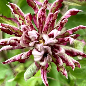 早咲きのクレマチスが咲き始めました ピンクの八重に緑が入った大輪の花がとっても目立ちます