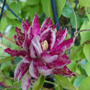クレマチス/花炎(かえん) こちらは我が家の赤色ゾーンのクレマチス❣️ 八重咲きの個性的なクレマチスです♪ 気温によって花色が赤一色になったり緑が混じったりします。 今はこんな感じで咲いています🤗