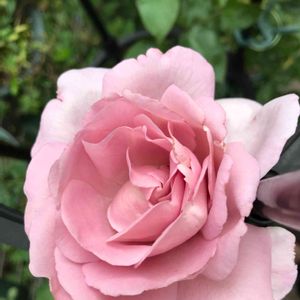 ローズシナクティフ💗開花 先日の雨で花びらが痛んでしまいました。 写真よりもう少し紫がかった花です。