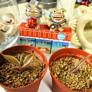 去年、忘師匠に教えてもらった水耕栽培👍 今年もはじめました👍 手前の6個 チタノタ 笹の雪黄覆輪 フランスアイボリー 屈原 のカキ仔たち 後ろの2つは 何年か前に忘師匠の プレゼント企画で頂いた アガベです😄 らしい姿になってきてます👍 お約束?のシーサーと😄