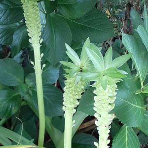 パイナップルリリーです‼️ お隣さんから20年前位に頂いたのが増えました‼️ 今はほったらかしなので大きくならないです‼️ 本当は凄く大きな花です‼️