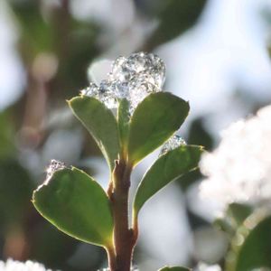 庭のキンメツゲの葉先で、昨日の雨粒が凍って朝日に輝いていました。