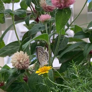 今日は曇り空…少し秋めいてきました。 寄せ植えしているダークベルグデイジーに 小さなお客様°ʚ(*´˘`*)ɞ° 千日紅とダークベルクデイジーを 行ったり来たりしていました•*¨*•.¸¸♬︎