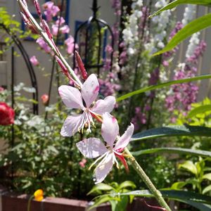 庭でガウラ ヤマモモソウ(山桃草)が咲いています。白すぐ脇で咲いていますが、これは薄いピンクの花です。別名ハクチョウソウ(白蝶草)