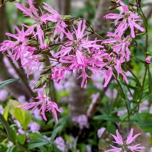 リクニス フロスククリ🌸 我が家では古株さんですが、放ったらかしであちこちに増えます💦 これは、アオハダの木の下で。 なんだかもしゃもしゃですが、ひとつのお花(右下)はすごく美しい~(ღ*ˇ ˇ*)。o♡