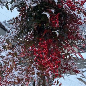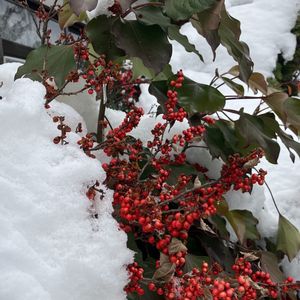 涼を求めて、冬景色を再び ⑦の2 (冬に咲く花で、涼んで…) ・雪にかぶる 赤ナンテン の実・赤 ≪ 2022/12/18ごろ≫ -----
