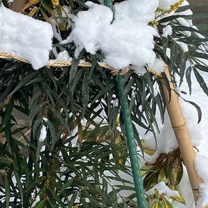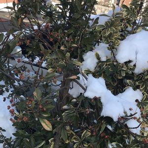 涼を求めて、冬景色を再び ⑧ (冬に咲く花で、涼んで…) ・雪を抱えた街路樹 ツルマサキ(?) と その仲間達……。 ≪ 2022/02/18ごろ≫ -----